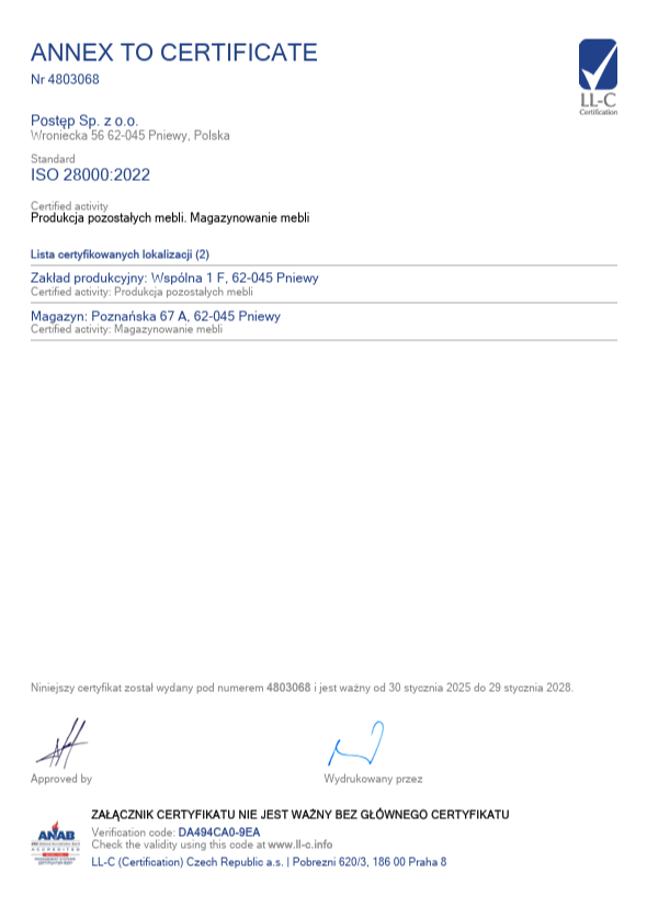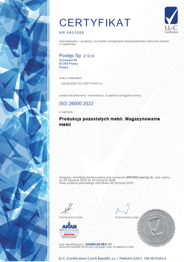 W firmie Postęp stawiamy na najwyższą jakość i odpowiedzialność środowiskową. Nasze procesy produkcyjne spełniają międzynarodowe normy, w tym ISO 14001 (zarządzanie środowiskowe), ISO 28000 (bezpieczeństwo łańcucha dostaw) oraz ISO 50001 (efektywność energetyczna).