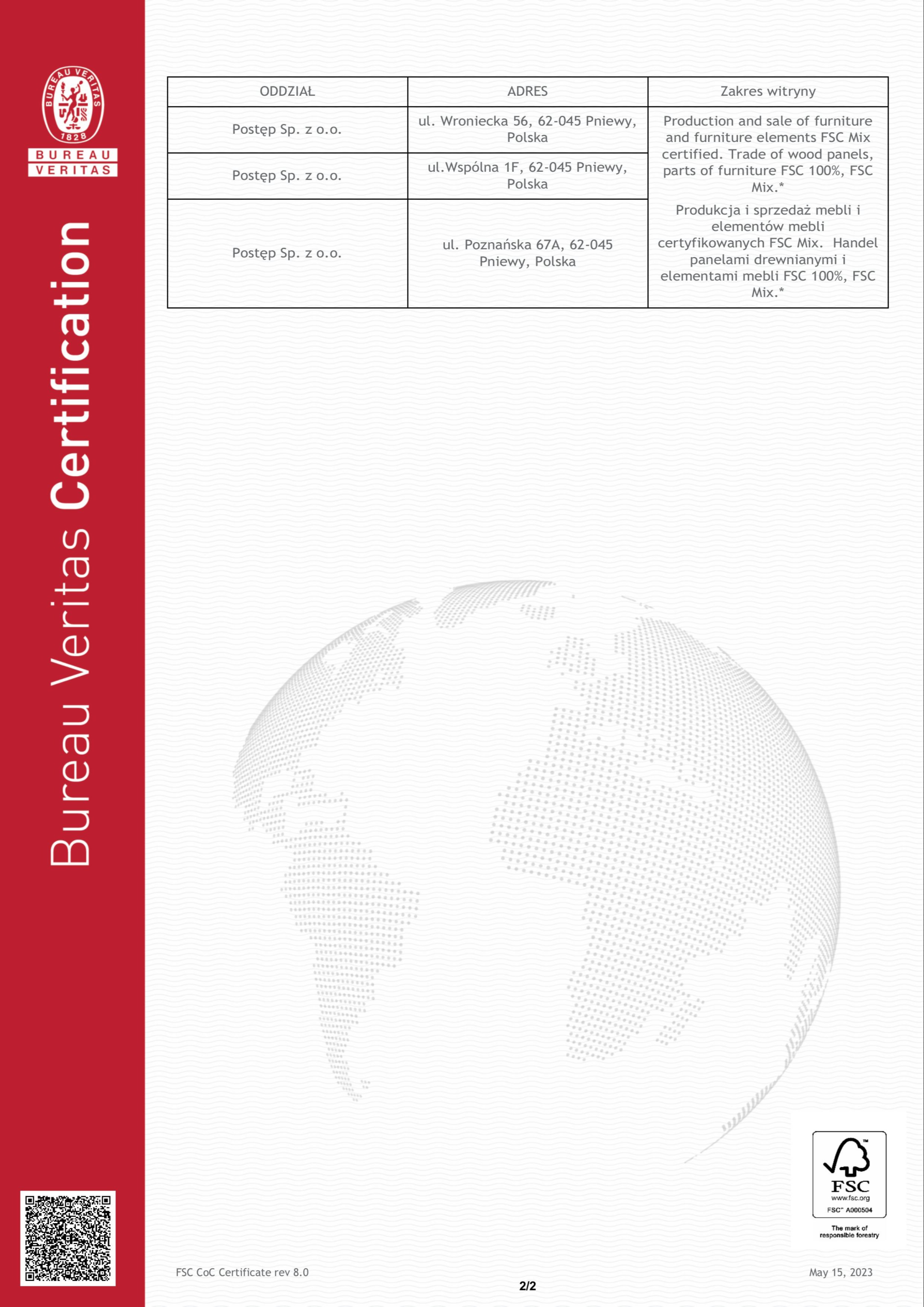 Każdy etap produkcji, od surowca po gotowy produkt, jest monitorowany i udoskonalany. Dzięki wykorzystaniu nowoczesnych technologii, takich jak malowanie proszkowe, wodne farby UV oraz certyfikowane materiały, w tym drewno z certyfikatem FSC, dbamy o minimalny wpływ na środowisko. Procesy są nieustannie optymalizowane, aby ograniczyć zużycie surowców, emisje i inne negatywne skutki dla planety, nie rezygnując przy tym z wysokiej jakości naszych produktów.