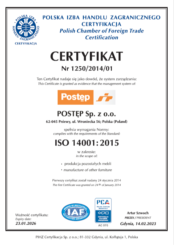 W firmie Postęp stawiamy na najwyższą jakość i odpowiedzialność środowiskową. Nasze procesy produkcyjne spełniają międzynarodowe normy, w tym ISO 14001 (zarządzanie środowiskowe), ISO 28000 (bezpieczeństwo łańcucha dostaw) oraz ISO 50001 (efektywność energetyczna).