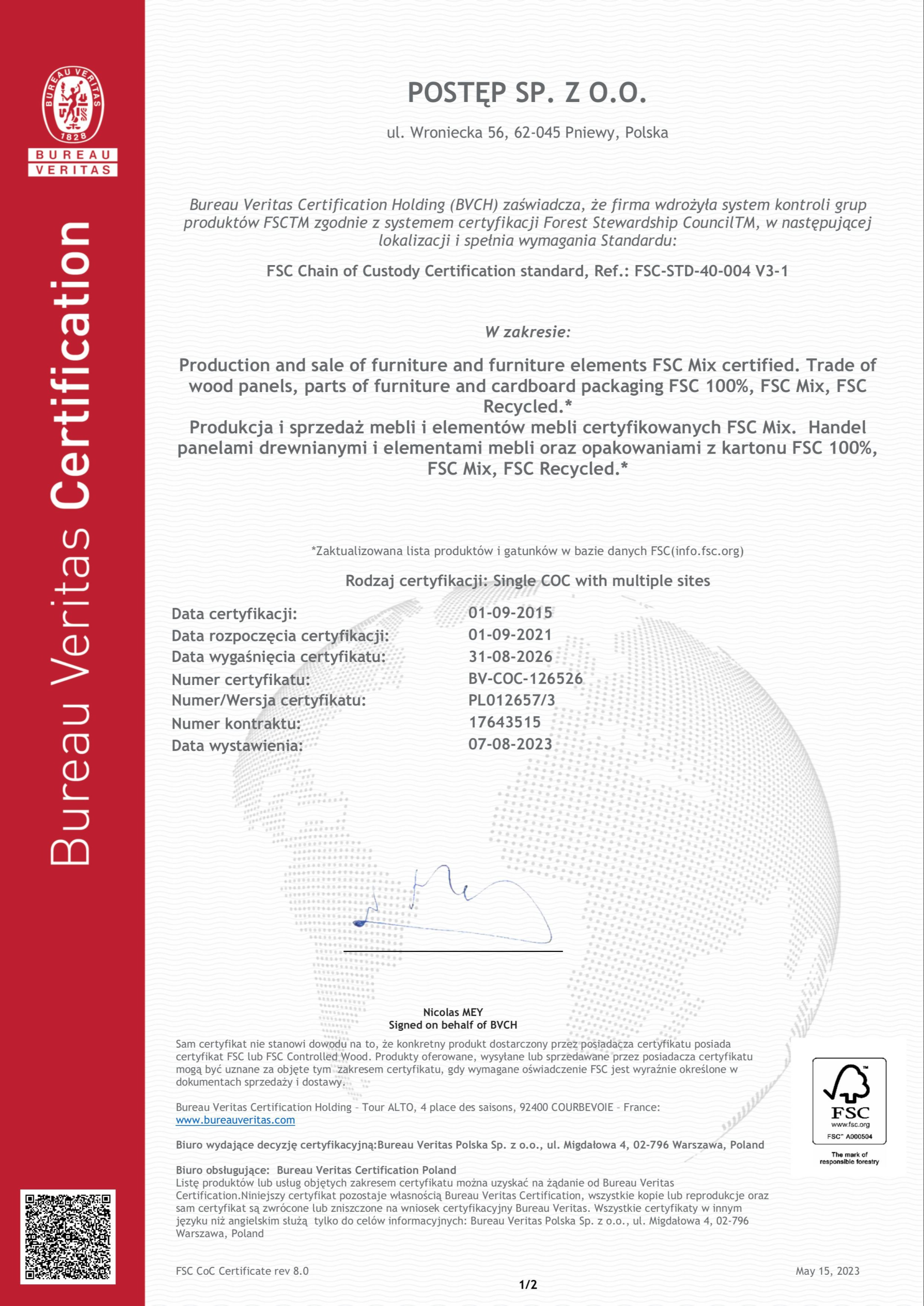 Każdy etap produkcji, od surowca po gotowy produkt, jest monitorowany i udoskonalany. Dzięki wykorzystaniu nowoczesnych technologii, takich jak malowanie proszkowe, wodne farby UV oraz certyfikowane materiały, w tym drewno z certyfikatem FSC, dbamy o minimalny wpływ na środowisko. Procesy są nieustannie optymalizowane, aby ograniczyć zużycie surowców, emisje i inne negatywne skutki dla planety, nie rezygnując przy tym z wysokiej jakości naszych produktów.